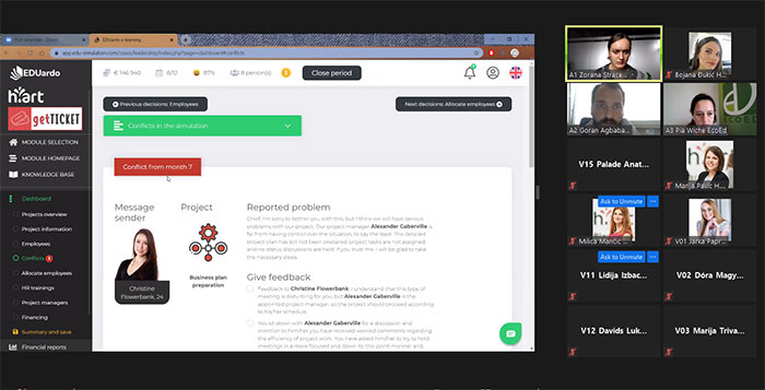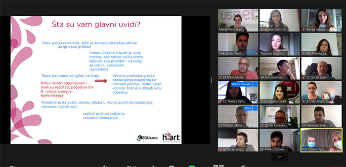 Tokom jula i septembra 2020. godine, organizovali smo tri online takmičenja u EDUardo biznis simulaciji iz oblasti liderstva, okupljajući menadžere, HR stručnjake i profesionalce iz različitih industrija. Prvo takmičenje održano u julu 2020. po prvi put je spojilo učesnike iz različitih kompanija u zajedničkoj online simulaciji koja stavlja fokus na ključne lideršip veštine kroz vođenje virtuelne kompanije i donošenje strateških odluka. Zbog velikog interesovanja, usledilo je i drugo takmičenje u septembru 2020., gde su učesnici, podeljeni u manje timove, imali priliku da se bolje upoznaju sa primenom veština liderstva kao što su: delegiranje, motivisanje, razvoj, fidbek i praćenje. Na kraju događaja svi timovi su razmenili iskustva i dobili povratne informacije od publike i naših trenera. Istog meseca, 15. septembra, organizovali smo i posebno, treće takmičenje – ovoga puta u potpunosti na engleskom jeziku, kako bismo uključili klijente i kolege iz inostranstva. Učesnici iz različitih delova sveta imali su priliku da se oprobaju u našoj jedinstvenoj simulaciji poslovanja, podele svoje perspektive i međusobno razmene načine rada. Hvala svima koji su se uključili i obogatili atmosferu naših online događaja. Jul 2020.- https://youtu.be/yFhBraOVpSE Septembar 2020. na engleskom- https://youtu.be/KWIiOKVqzuk